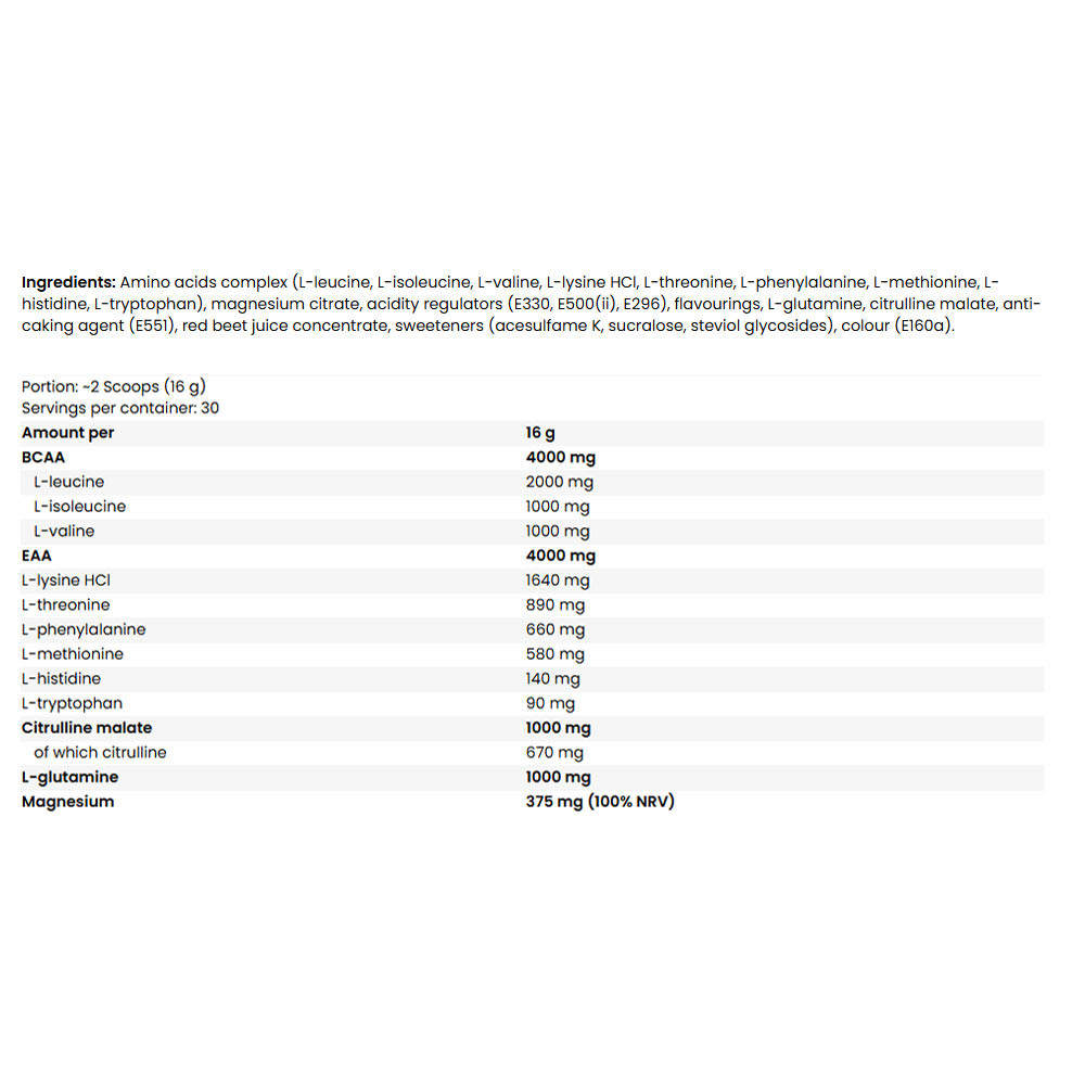 Fitness Authority Ice Hydro Amino - doplněk stravy bohatý na aminokyseliny obsahující mimo jiné exogenní aminokyseliny (EAA), větvené aminokyseliny (BCAA), L-glutamin a citrulin.