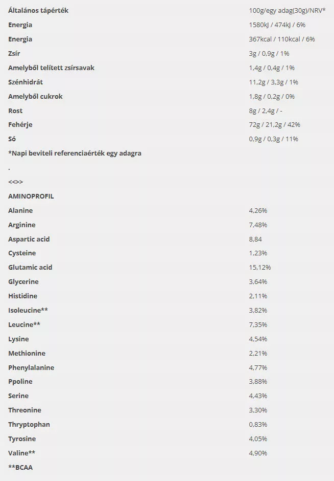• Vysoký obsah bílkovin: jedna porce (30 g) proteinového prášku obsahuje nejméně 21-22 g rostlinných bílkovin