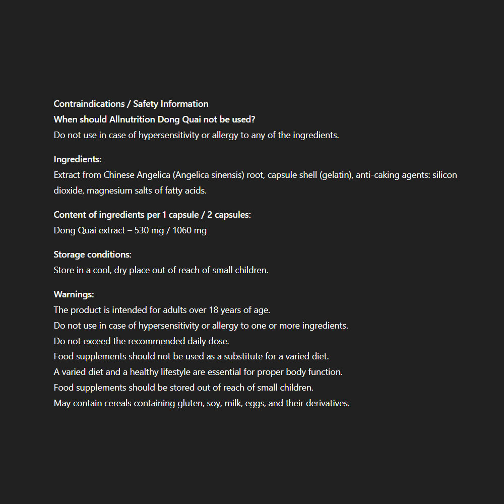 ALLNUTRITION DONG QUAI obsahuje 1060 mg extraktu z kořene dong quai v doporučené denní dávce. Doplněk je v kapslích, které se snadno polykají, a podporuje zdraví žen v různých fázích jejich cyklu.
