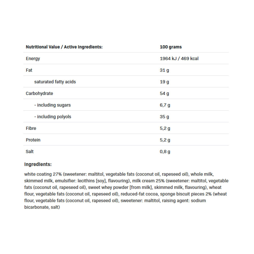 Obsahuje sladidlo. Obsahuje přirozeně se vyskytující cukry. Nekonzumujte v případě alergie. Nadměrná konzumace může mít projímavý účinek. Může obsahovat stopy ořechů, sezamu, mléka a mléčných výrobků.