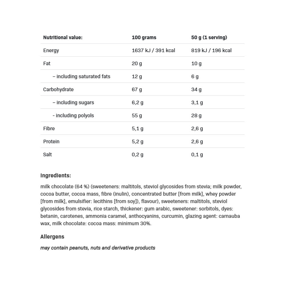 Dražé vyrobené z mléčné čokolády s barevným povlakem, bez přidaného cukru. Obsahuje sladidla. Může obsahovat přirozeně se vyskytující cukry. Nekonzumujte, pokud jste alergičtí nebo citliví na některou ze složek. Nadměrná konzumace může způsobit projímavý efekt. Doporučuje se vyvážená strava a zdravý životní styl. Může obsahovat arašídy, ořechy a jejich deriváty.