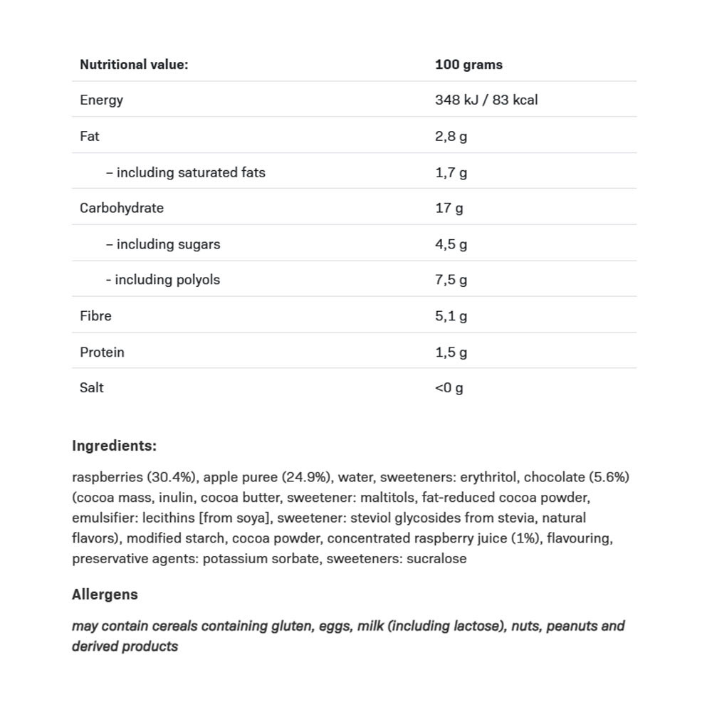 Použili jsme erythritol – jeden z nejoblíbenějších přírodních náhrad cukru. Díky tomu si FRULOVE CHOCO IN JELLY RASPBERRY zachovává plnou, lahodnou chuť bez zbytečných kalorií! Navíc obsahuje pouze 2,8 g tuku na 100 g výrobku!