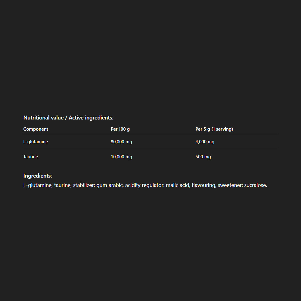 ALLNUTRITION GLUTAMINE RECOVERY AMINO je doplněk stravy obsahující L-glutamin, obohacený o aminokyselinu taurin. Glutamin je jednou ze tří nejdůležitějších a nejběžnějších aminokyselin v lidském těle a hraje klíčovou roli v jeho každodenním fungování – zejména u fyzicky aktivních jedinců.
