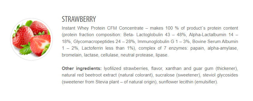 • Bílkovinnou část výrobku tvoří výhradně instantní syrovátkový koncentrát CFM, nejvyšší kvality ze zemí EU.