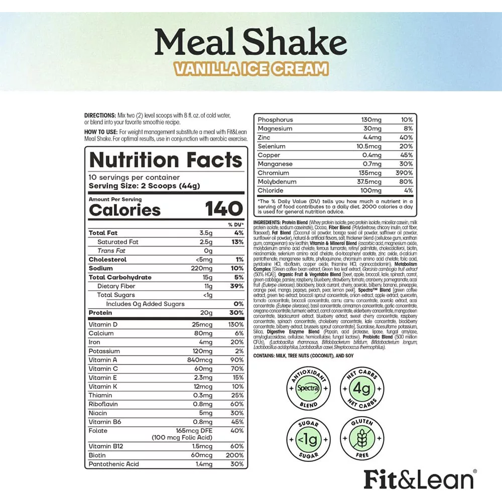 Fit and Lean Meal Shake obsahuje zelená kávová zrna, Garcinii Cambogia a zelený čaj, které pomáhají zrychlit metabolismus a spalovat tuky. Díky vysokému obsahu vlákniny a bílkovin vás Meal Shake také udrží déle syté a spokojené, čímž předchází přejídání a zbytečnému mlsání. V přehledu 22 studií o hubnutí vědci zjistili, že zařazení náhrady jídla do jídelníčku je pro snížení hmotnosti prospěšné. Výsledky naznačují, že 30 %–60 % denního příjmu kalorií by mělo pocházet z náhrady jídla místo běžného jídla.