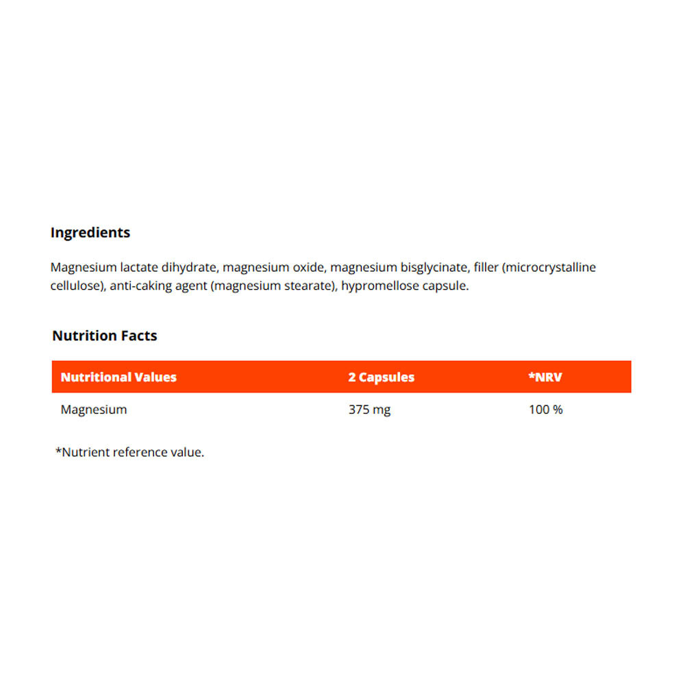 Triple Magnesium jsou kapsle, které obsahují hořčík ve třech formách. Hraje důležitou roli v těle, protože podporuje celkové zdraví. Konkrétně obsahuje chelátovou formu jako bisglycinát, dále oxid hořečnatý a laktát hořečnatý. Tato kombinace tak spojuje výhody všech těchto forem. Jedna dávka poskytuje 375 mg hořčíku, což splňuje doporučenou denní dávku.
