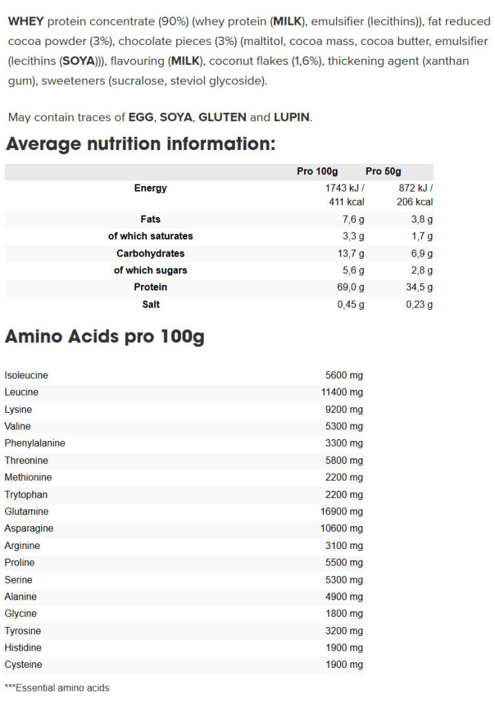 Doporučená denní dávka by neměla být překročena. Nepoužívejte jako náhradu pestré stravy. Uchovávejte mimo dosah malých dětí. Uchovávejte mimo dosah tepla, vlhkosti a slunečního záření. Bílkoviny přispívají k růstu svalové hmoty. Důležitá je vyvážená a pestrá strava a zdravý životní styl. Obsahuje přirozeně se vyskytující cukry.