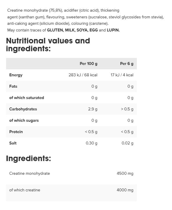 S práškem IronMaxx® Creatine Flavoured Zero 6 g můžete svému tělu dodat 4,5 g kreatin monohydrátu nebo 4 g čistého kreatinu. Jednoduše smíchejte 6 g kreatinového prášku s 200 ml vody a doplňte si zásoby kreatinu. Zvláštností tohoto výrobku je neodolatelná chuť. Kreatin v 200ml hotovém nápoji dokonce neobsahuje žádný cukr, takže náš ochucený kreatin můžete bez obav užívat i během diety.