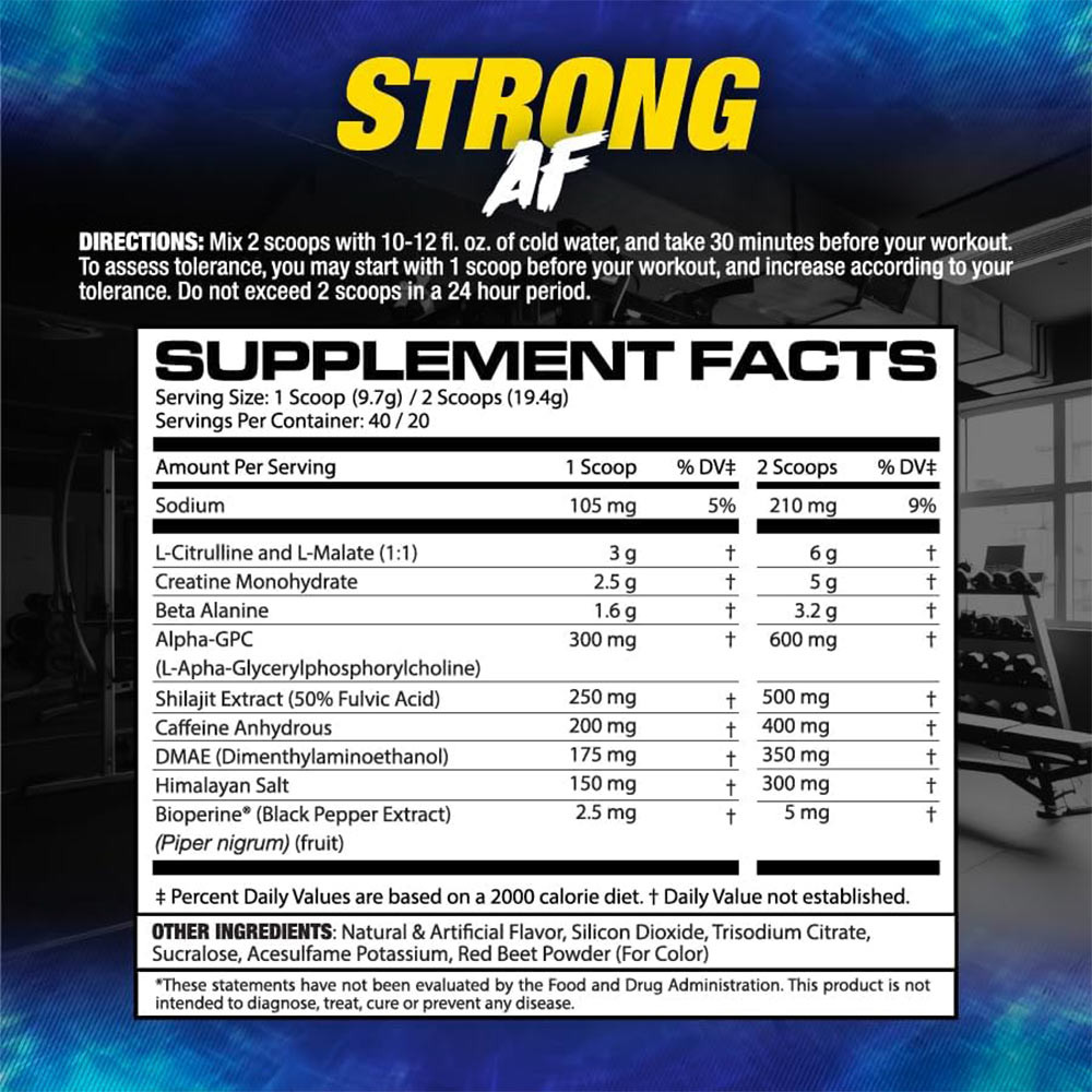 SILNÝ PŘEDTRÉNINKOVÝ DOPLNĚK: Složení s klinicky ověřenými ingrediencemi v účinných dávkách, STRONG AF využívá synergii více drah k optimalizaci svalové síly, intenzity tréninku, mentálního soustředění, energie, zlepšeného prokrvení, svalového napumpování a testosteronu pro maximální výkon při tréninku, budování svalů a regeneraci.
