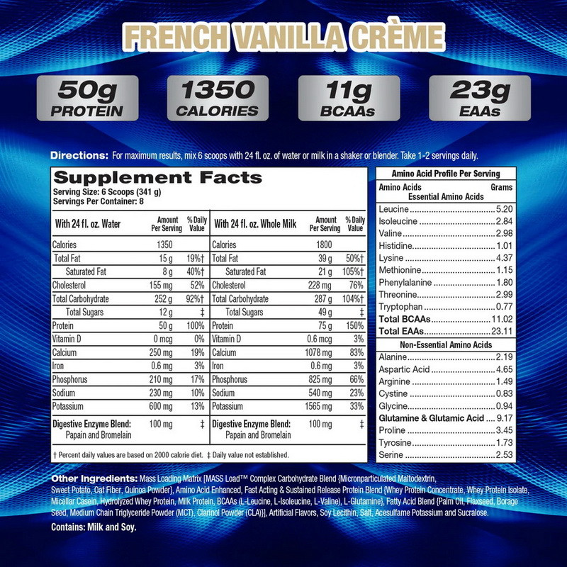 Nový UP YOUR MASS XXXL 1350 od MHP je nutričně hustý gainer nabitý 1350 kaloriemi pro budování svalové hmoty. Každá dávka obsahuje 50 gramů rychle působících bílkovin s dlouhodobým uvolňováním, které vám pomohou budovat svalovou hmotu, zvyšovat sílu a zlepšovat regeneraci. Tento vysoce pokročilý proteinový matrix (syrovátkový proteinový koncentrát, syrovátkový proteinový izolát a hydrolyzovaný syrovátkový protein) plus pomalu stravitelné bílkoviny (micelární kasein a mléčný protein) poskytuje rychlé i dlouhodobé výhody při zadržování dusíku. Mass Load™ Complex Carbs obsahuje 250 gramů komplexních sacharidů (maltodextrin s mikročásticemi, sladké brambory, ovesnou vlákninu a quinou) a funkční tuky, jako jsou mct, efas a CLA , a vytváří tak dokonalé metabolické a hormonální prostředí pro dosažení maximálních výsledků