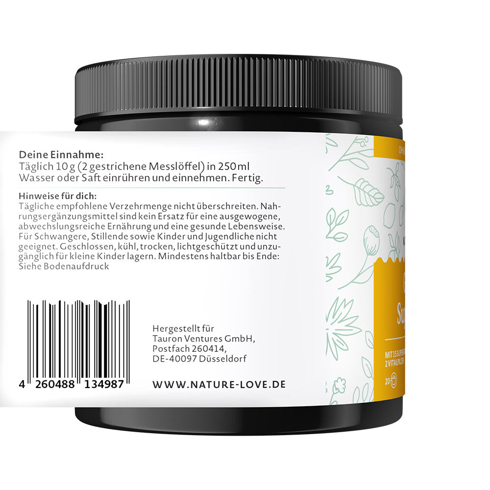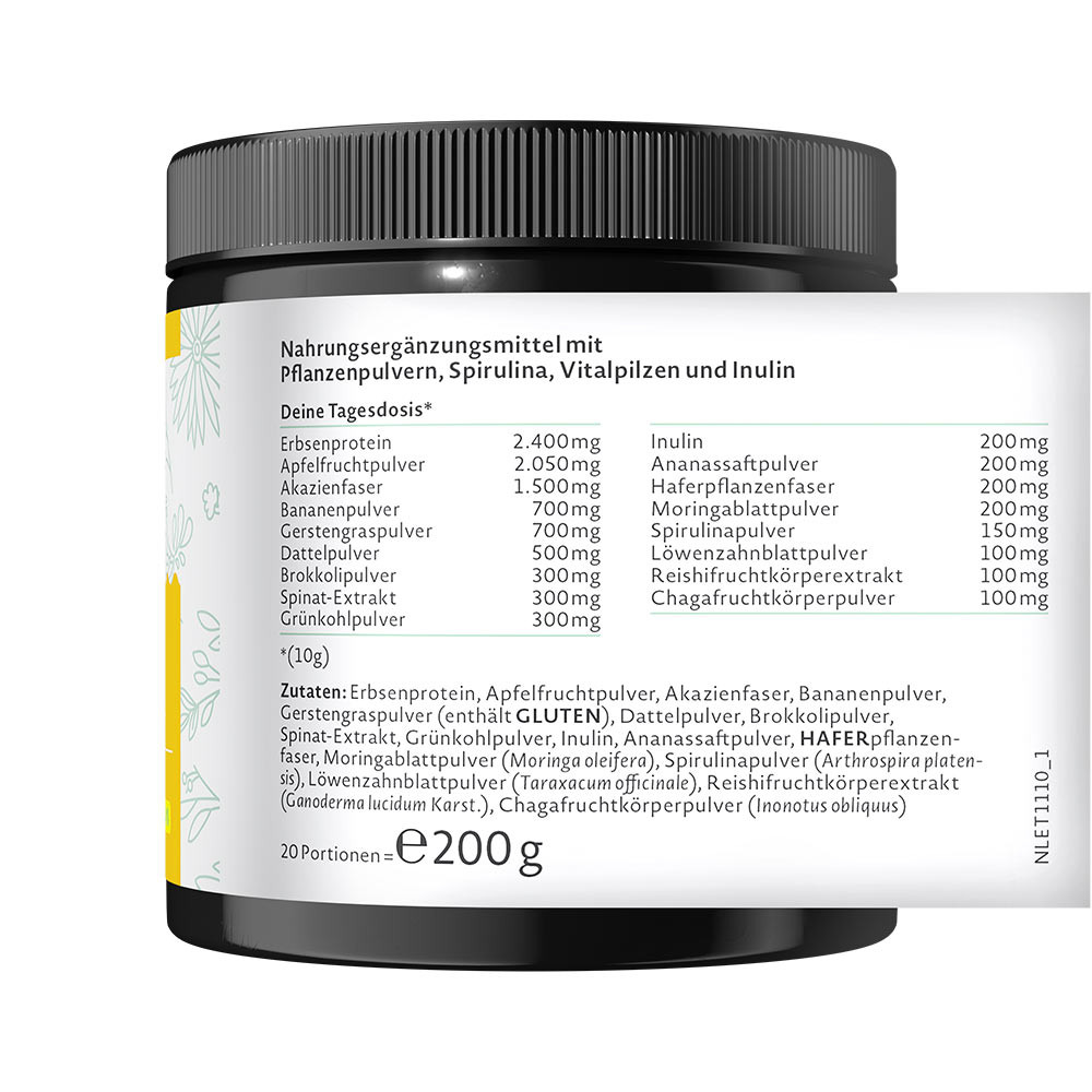 Non-GMONeexistuje nic zelenějšího: náš superpotravinový prášek ve velmi vysoké dávce vám mimořádně snadno a příjemně umožní dopřát vašemu tělu každodenní extra porci „zeleného“ na celý měsíc. Například jako uklidňující shake – jupí! Vedle mnoha superpotravin jako jsou spirulina, listy moringy, ječmenná tráva a 2 léčivé houby obsahuje také různé prášky z ovoce a zeleniny jako jsou banán, jablko, datle a brokolice. Celkem 17 cenných ingrediencí s přírodní silou. Opravdu zeleeeené – a poznáte to i na chuti.