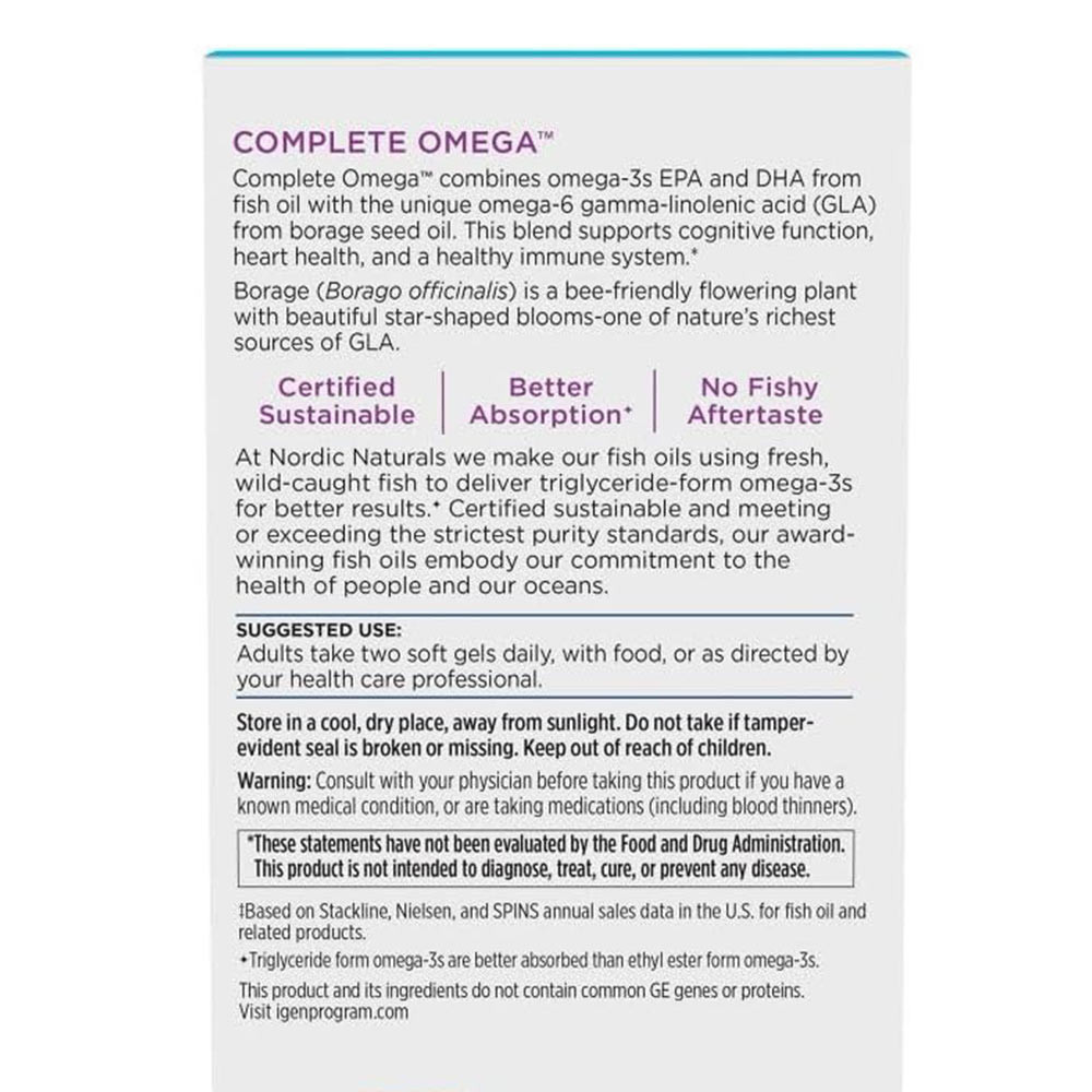 Vedle výhod omega-3 má Complete Omega přidané výhody dalšího esenciálního tuku, GLA (kyselina gama linolenová) pro další podporu zdravé pokožky a kloubů. Complete Omega je nekoncentrovaná, přirozeně vyvážená receptura, která kombinuje omega-3 EPA+DHA ze studenovodních ryb s GLA a kyselinou olejovou (omega-9) z brutnákového oleje lisovaného za studena. Tradiční rostlinný olej z brutnáku lékařského také údajně podporuje dobrou náladu. To je kompletní doplněk.