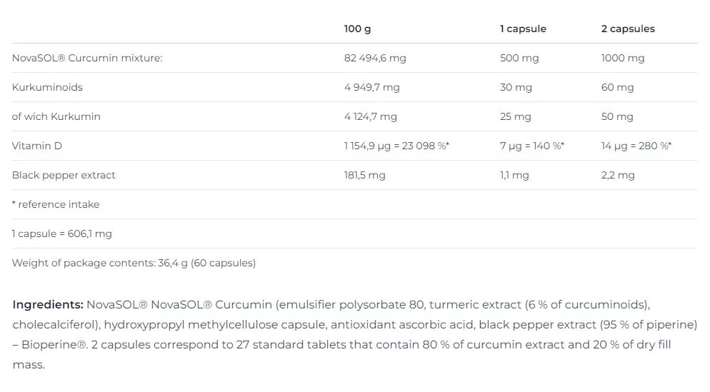Produkt Kurkumin od společnosti NUTREND má antioxidační účinky, je zápalný, podporuje trávení a je ideálním produktem pro detoxikační plány. Díky vitaminu D je také účinnější funkce imunitního systému a pomáhá posilovat kosti a zuby. Obsahuje značkové složky, jako je extrakt Bioperine, který byl jako jediná složka patentován pro svou schopnost zvýšit biologickou likvidaci výživového materiálu.