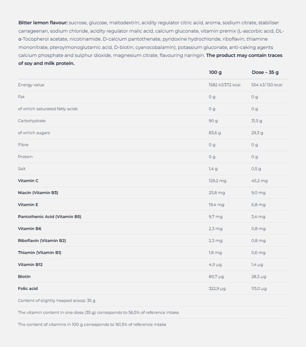 Ochucený nealkoholický obohacený nápoj s cukry a sladidly. Složení speciálně pro sportovce. Určeno pro zvláštní výživové účely. Není určeno pro děti do 3 let. Uchovávejte mimo dosah dětí!