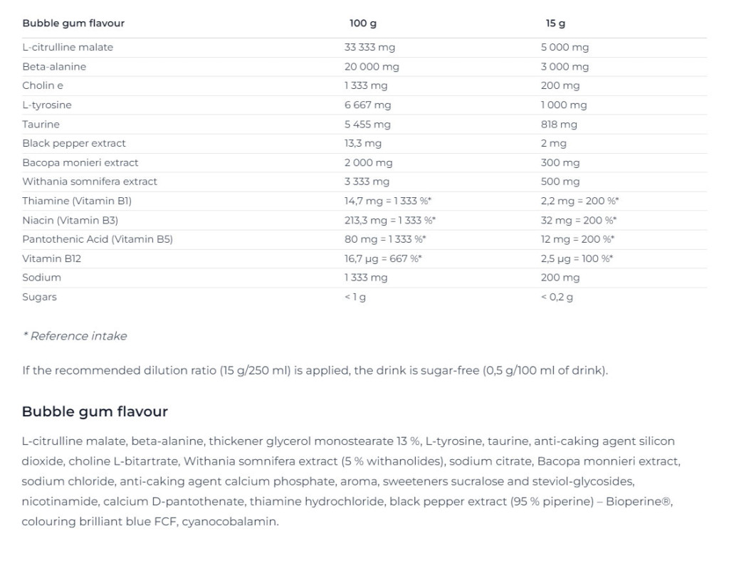 Vzhledem k vysoké koncentraci účinných látek se v nápoji objevují nerozpuštěné částice. Pro tento produkt je to přirozené a nemělo by to být považováno za chybu. Pocit mravenčení je běžnou reakcí! Sáčky obsažené ve výrobku nejsou určeny k přímé konzumaci. Nenahrazuje pestrou stravu. Nevhodné pro děti a těhotné a kojící ženy. Uchovávejte mimo dosah dětí! Chraňte před teplem, mrazem a vlhkostí.