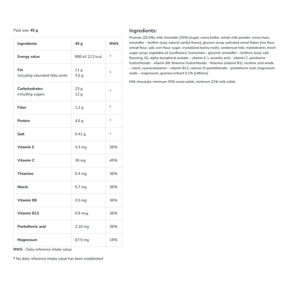 Ideální před cvičením nebo během něj, či jako energeticky povzbuzující svačina během dne. Díky svému kompaktnímu 45 g balení ji snadno vezmete kamkoli – do práce, školy, na výlety nebo do posilovny.