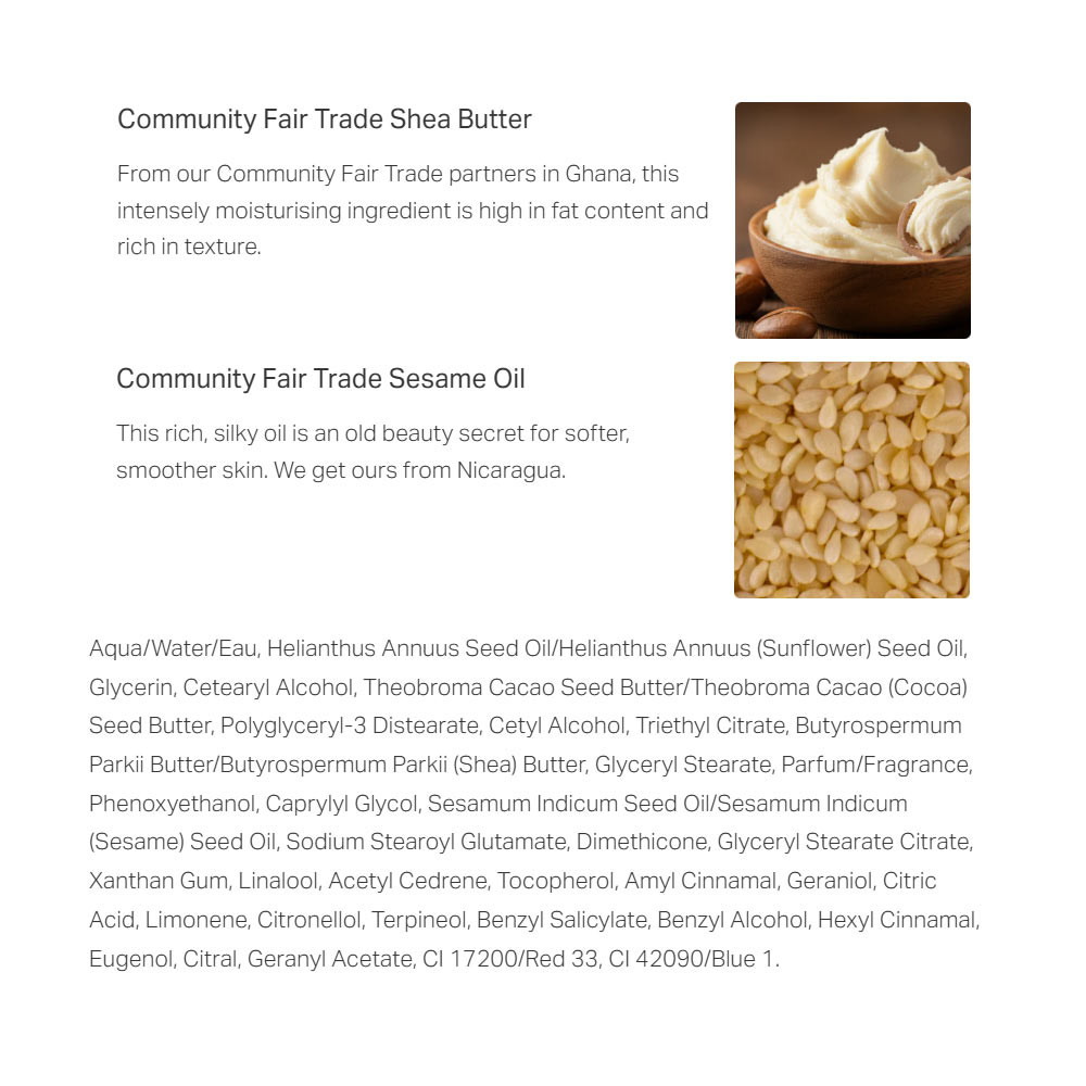 Tento lahodný krém se rozplývá na suché pokožce a uzamyká hydrataci na 96 hodin, aniž by zanechával mastný pocit. Pokožka je okamžitě jemnější, hladší a je o ni postaráno. Vůně? Ovocně-květinová směs šťavnaté ostružiny, čerstvých zelených listů, jemné frézie s základem z cedrového dřeva a hebkého pižma. Je nostalgická, ale zároveň dokonale moderní.