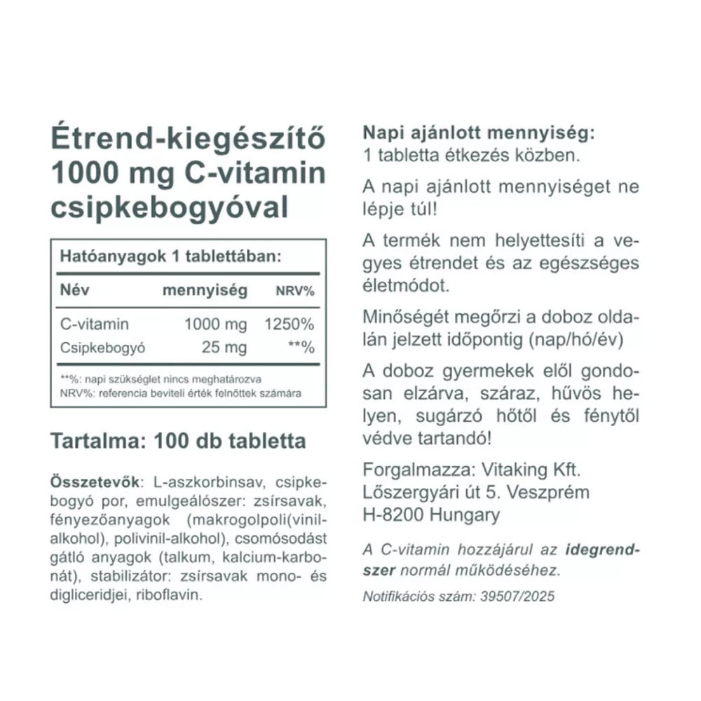 Užívání vitaminu C je dnes základní. Tento Vitaking 1000 mg Vitamin C obsahuje více šípku než průměrně, poskytuje 25 mg této cenné látky v jedné tabletě. Vynikající složení s výjimečně dobrým poměrem ceny a výkonu. Vitamin C má v těle mnoho funkcí a každý ho potřebuje bez ohledu na věk či pohlaví.