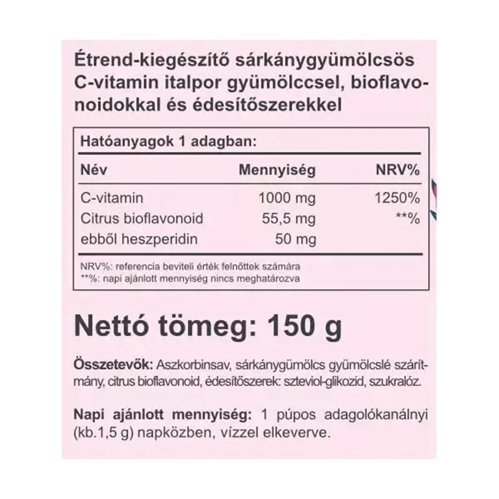 1 denní dávka obsahuje 1000 mg vitaminu C + 55,5 mg citrusových bioflavonoidů (z toho hesperidin 50 mg) Příchutě: extrakt ze šťávy dračího ovoce, steviol-glykosid, sukralóza.