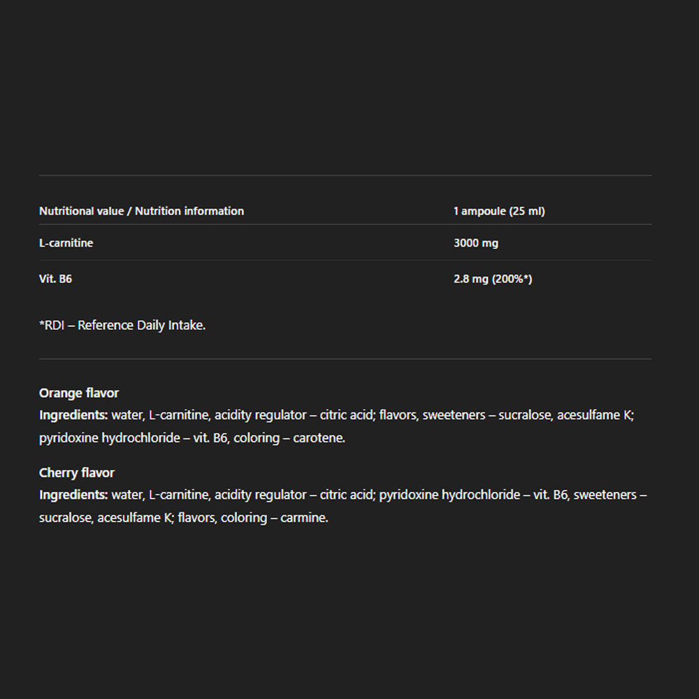 3 000 mg L-karnitinu plus vitamín B6 v 25 ml tekutém shotu pro rychlou absorpci a snadnou podporu energie kdykoliv